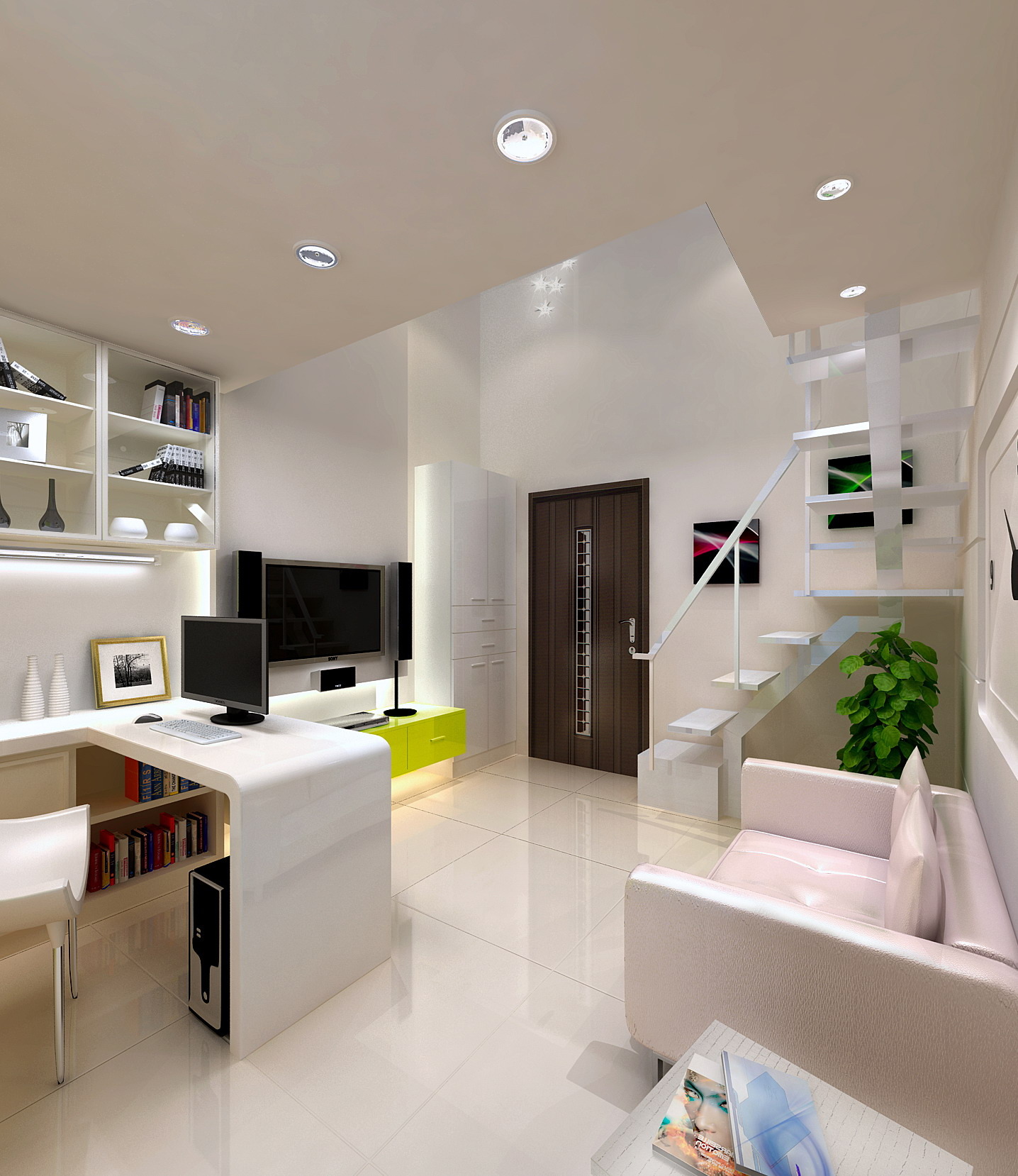 單身居住空間,風格走向設定為簡約時尚風格,與業主幾經討論後把局部的物件改為寶綠色鋼琴烤漆設計,電視牆造型雖然比較素面,由電視櫃一直延展到天花板,並搭配流星造型水晶燈之後,整體質感已表露無疑,沙發造型牆以日本進口掛鐘作為搭配設計更凸顯出業主的時尚品味,白色烤漆龍骨梯採用透空設計增加穿透感與採光,牆面的直線條造型有延伸空間的視覺效果,二樓懸空處以10mm強化玻璃作為安全防護,也兼具了視覺放大空間的用意,為了減緩入門既可一覽全室的感覺,在二樓護欄周邊加裝了黑色線簾平作為區隔,二樓窗邊的小窗戶景觀視野好,在不浪費空間的原則下安排了小型書桌,可供業主觀景與喜好創作的想像空間,對於小空間的充分利用更為著實,小坪數住宅是最能看出空間設計運用的表現所在